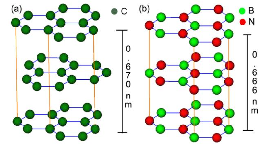 石墨(a)与六方氮化硼(b)晶格结构的对比