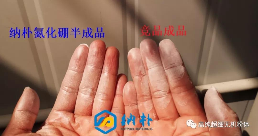 在下图中,左手涂抹为苏州纳朴自产的氮化硼半成品,右手涂抹为竞品氮化硼成品。